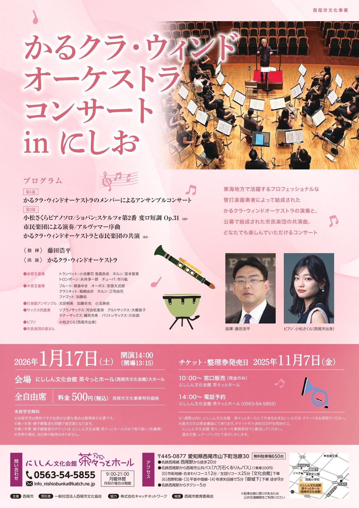 東海地方で活躍するプロフェッショナルの管打楽器奏者によって結成されたかるクラ・ウィンドオーケストラの演奏と、市民公募で結成された市民楽団の共演曲、西尾市出身のピアニスト小松さくらさんをソリストに迎え、はじめてウィンドオーケストラを鑑賞する方でも楽しんでいただけるコンサートです。