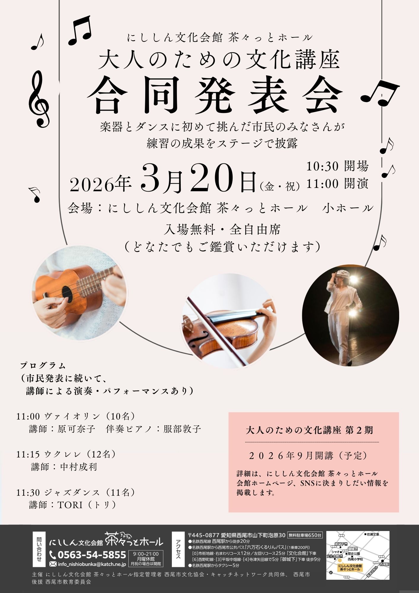 楽器とダンスにはじめて挑んだ市民の皆さんが練習の成果をステージで 9月に開講した第1期 大人のための文化講座「ヴァイオリン・ウクレレ・ジャズダンス」講座の合同発表会を行います。 日時:2026年 3月20日(金)10:30~ 場所:小ホール 入場無料(どなたでも鑑賞いただけます) 主催 西尾市文化協会・キャッチネットワーク共同体、西尾市 後援 西尾市教育委員会