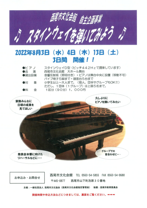 西尾市文化会館自主企画事業 ♬スタインウェイを弾いてみよう♬ ※ご好評につき、定員に達しましたので受付を終了させていただきます。