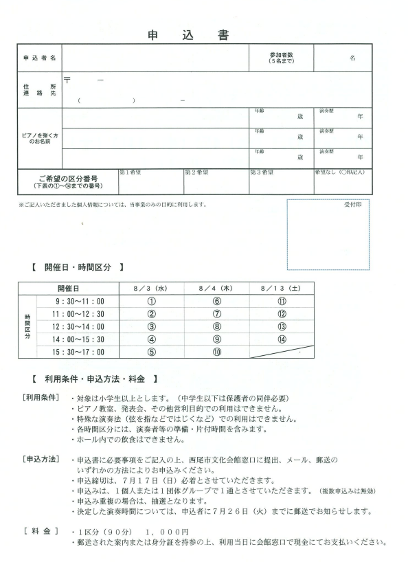 - 申込書に必要事項をご記入の上、西尾市文化会館窓口に
