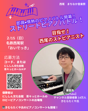 まで、まちなか音楽祭で開催する、うたうまバトル! ストリートピアノバトル!の出演者を募集しています